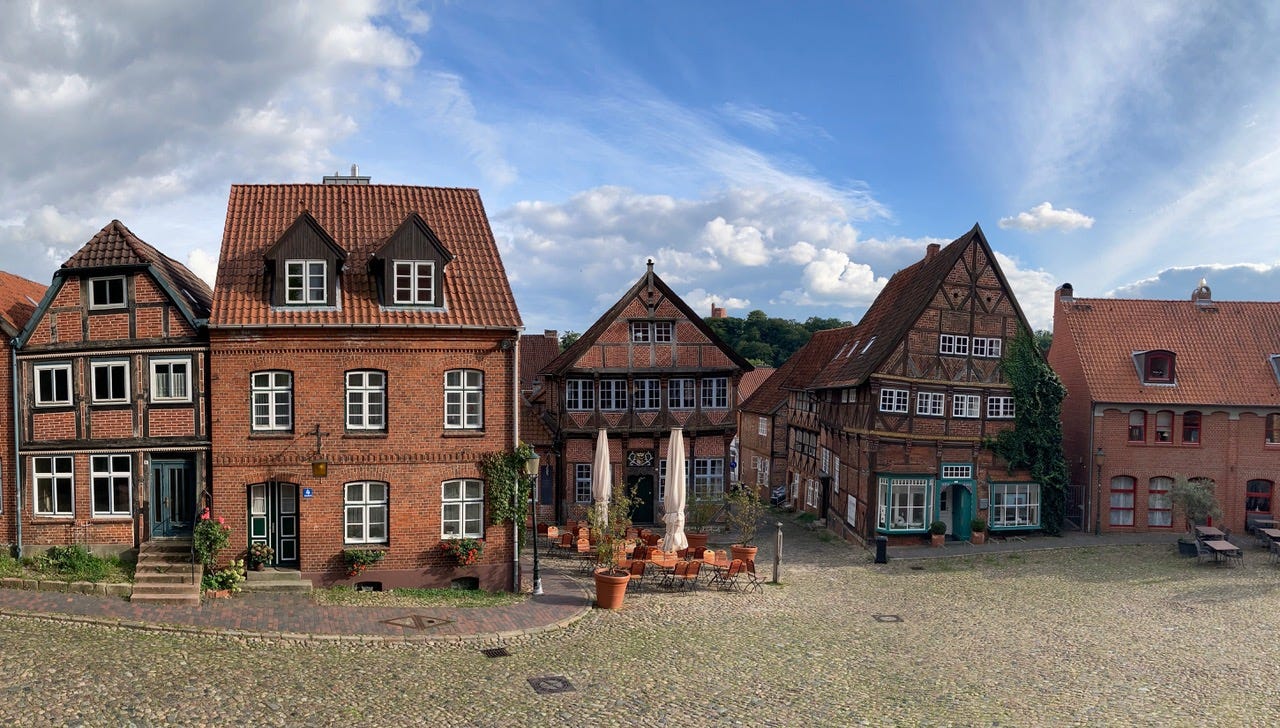 Im Internet lese ich die Hintergründe zu Shaws Ehrenbürgerschaft. Demnach wollten die Möllner Stadtverantwortlichen den 600. Todestag Till Eulenspiegels im Jahr 1950 gebührend feiern, sich dabei mit einem berühmten Namen schmücken und verfielen auf die Idee, den irischen Dramatiker, Satiriker und Literaturnobelpreisträger von 1925, George Bernard Shaw, nach Mölln einzuladen. Da die Stadtverordnung wegen des Missbrauchs mit Ehrenbürgerschaften im Nationalsozialismus diese nicht mehr vorsah, boten sie Shaw den Titel eines »Ehren-Eulenspiegel« an. Sie teilten ihm dies per Telegramm mit und luden ihn nach Mölln ein. Der dreiundneunzigjährige Shaw, der Eulenspiegel nicht kannte, antwortete per Postkarte, dass er aufgrund seines Alters nicht nach Mölln kommen könne, aber die Ehrenbürgerschaft der Stadt trotzdem annehmen werde. Diese Nachricht sorgte weltweit für Schlagzeilen und die Stadtverantwortlichen entschieden daraufhin notgedrungen, Shaw die Ehrenbürgerschaft doch zu verleihen. Für mich klingt die Geschichte weniger nach einer Eulenspiegelei, sondern viel mehr nach einem Schildbürgerstreich, und ich laufe die Treppe zum Kirchberg hinauf, von dem man einen großartigen Blick auf den Markt und die Fachwerkhäuser hat. Besonders fasziniert bin ich von dem schiefen und in sich zusammengesackten Haus mit der blaugrünen Schaufensterfront.