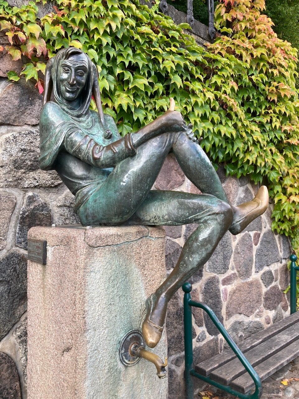 In der einen Hand die Eule, in der anderen den Spiegel, so ging er durch die Welt. Im Vergleich zum dünnen Brunnenschalk ist der Narr auf der knapp vierhundert Jahre zuvor entstandenen Kalksteinplatte allerdings viel runder und feister dargestellt. Den letzten Satz empfinde ich als Drohung, denn die Prophezeiung, ihm gleich zu werden, egal ob beleibt oder dürr, ist für mich eine Horrorvorstellung.