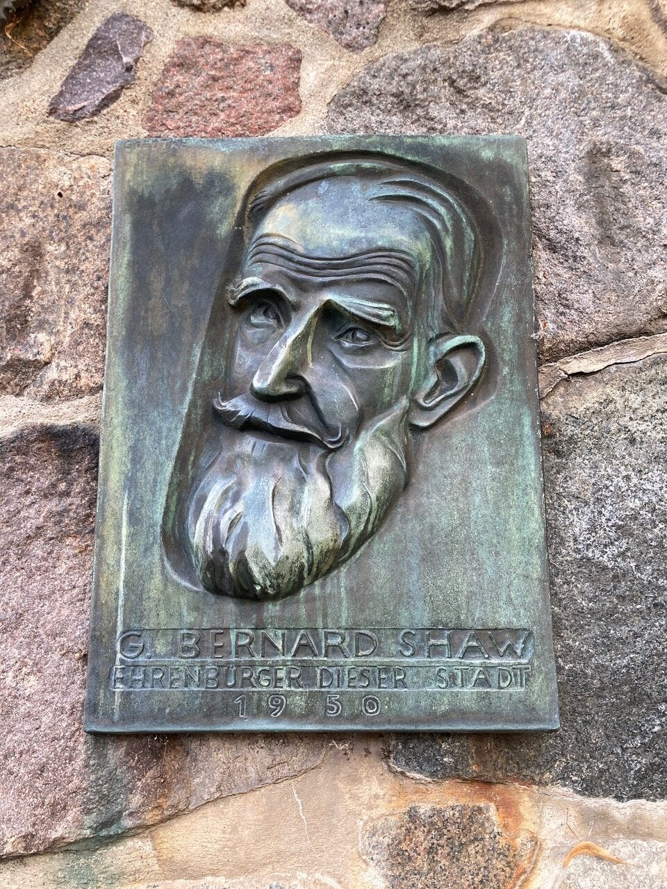 Die Plastik stammt vom Möllner Bildhauer Karlheinz Goedtke wie auch die Gedenktafel für den irischen Dramatiker und Satiriker George Bernhard Shaw an der Steinmauer links daneben.