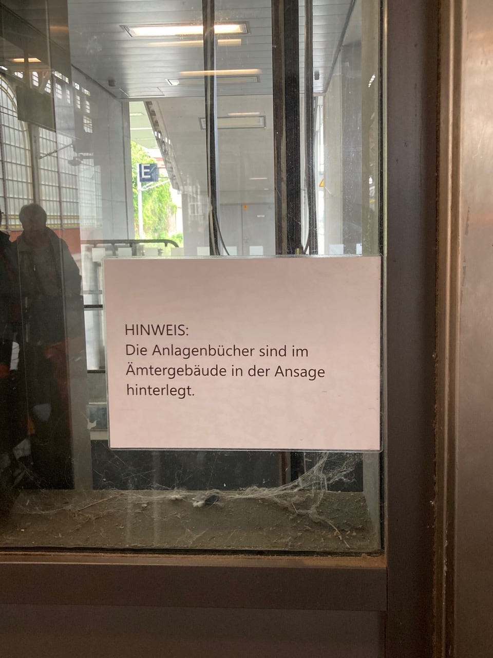 Um 11 Uhr 23 in Lübeck. Ich schiebe mein Rad zum Bahnhofsfahrstuhl, an dem ein rätselhaftes Schild angebracht ist: »HINWEIS: Die Anlagenbücher sind im Ämtergebäude in der Ansage hinterlegt.« Was sind Anlagenbücher, was ist die Ansage und wo ist das Ämtergebäude?